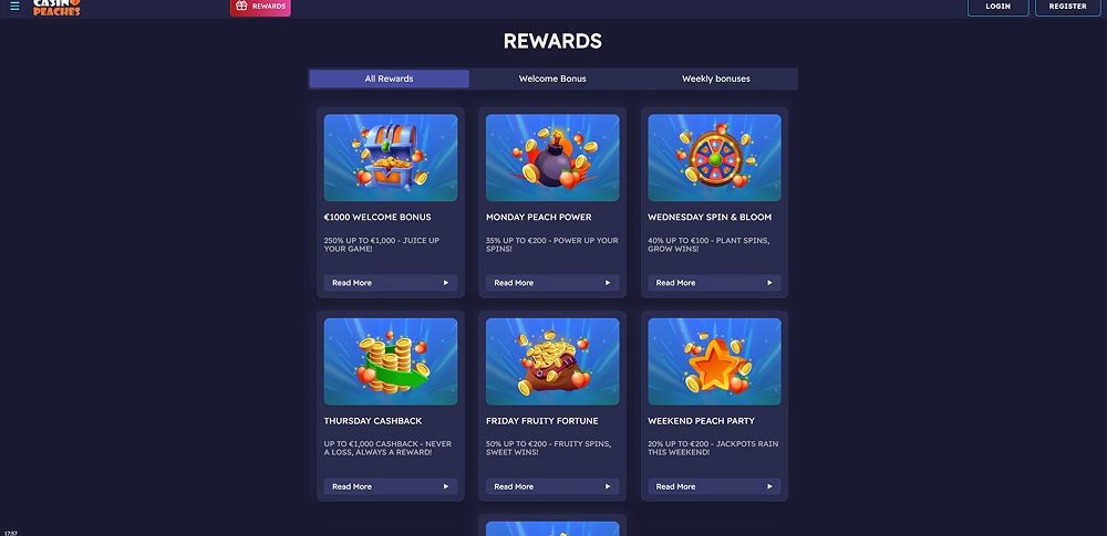 - MONDAY PEACH POWER — Begin your week with additional balance. Deposit €20 or more and get a 35% bonus up to €200. Start strong, spin harder, and aim higher. Remember that your Monday just got even better.