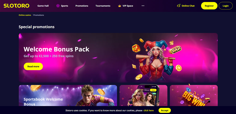 Get Up to €2,500 + 250 Free Spins. Besides the no deposit stuff, Slotoro Casino has a welcome deal for those who want to add funds. This deal makes your first three deposits better.
